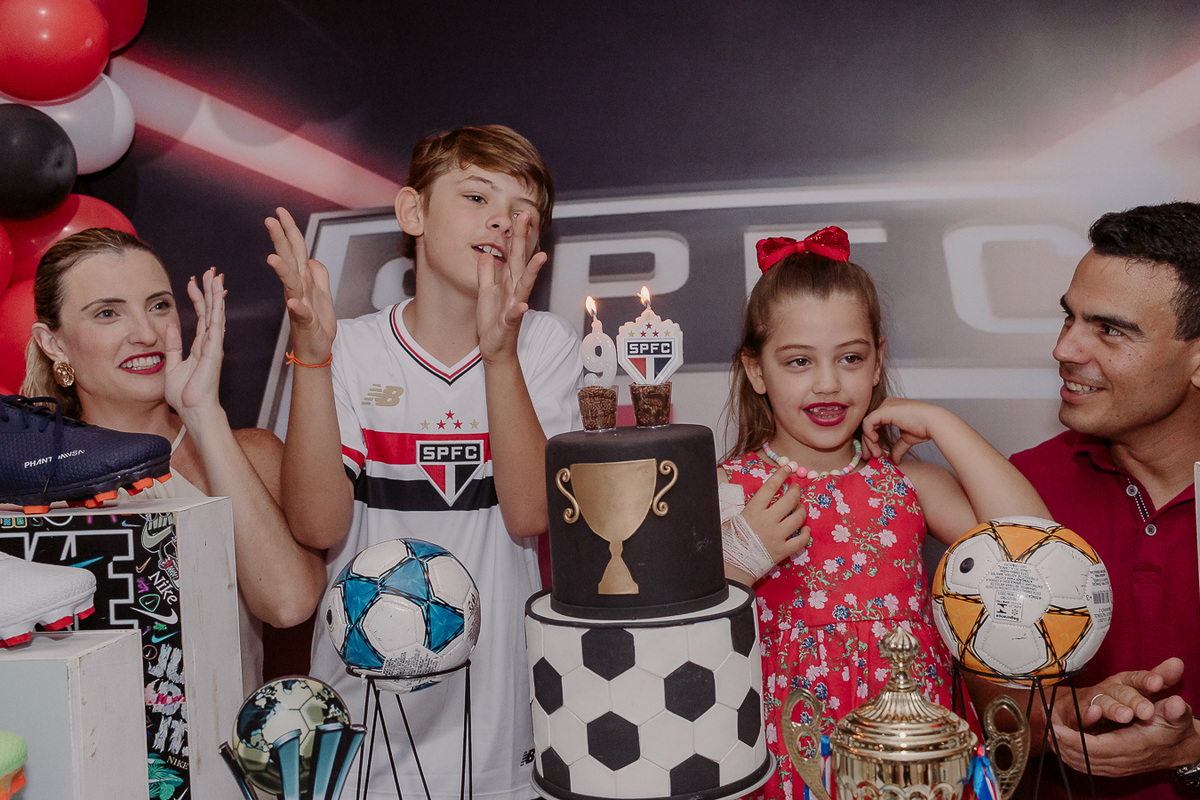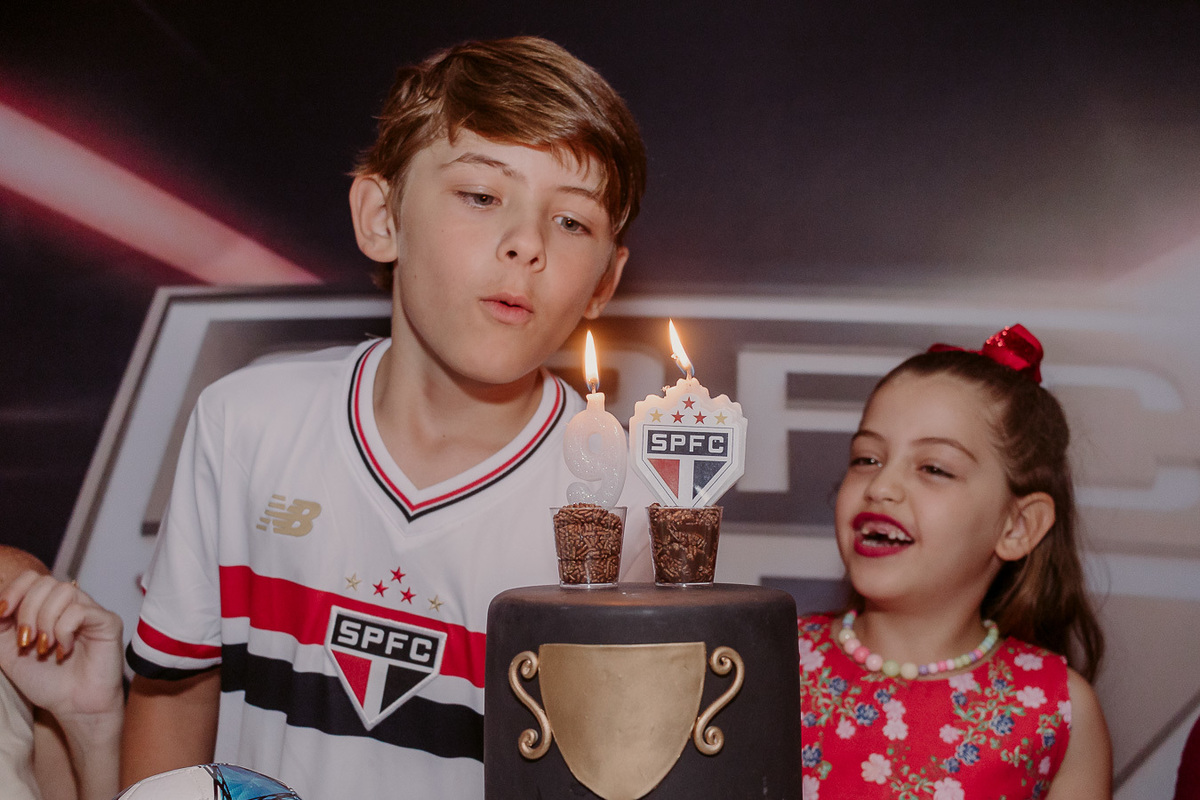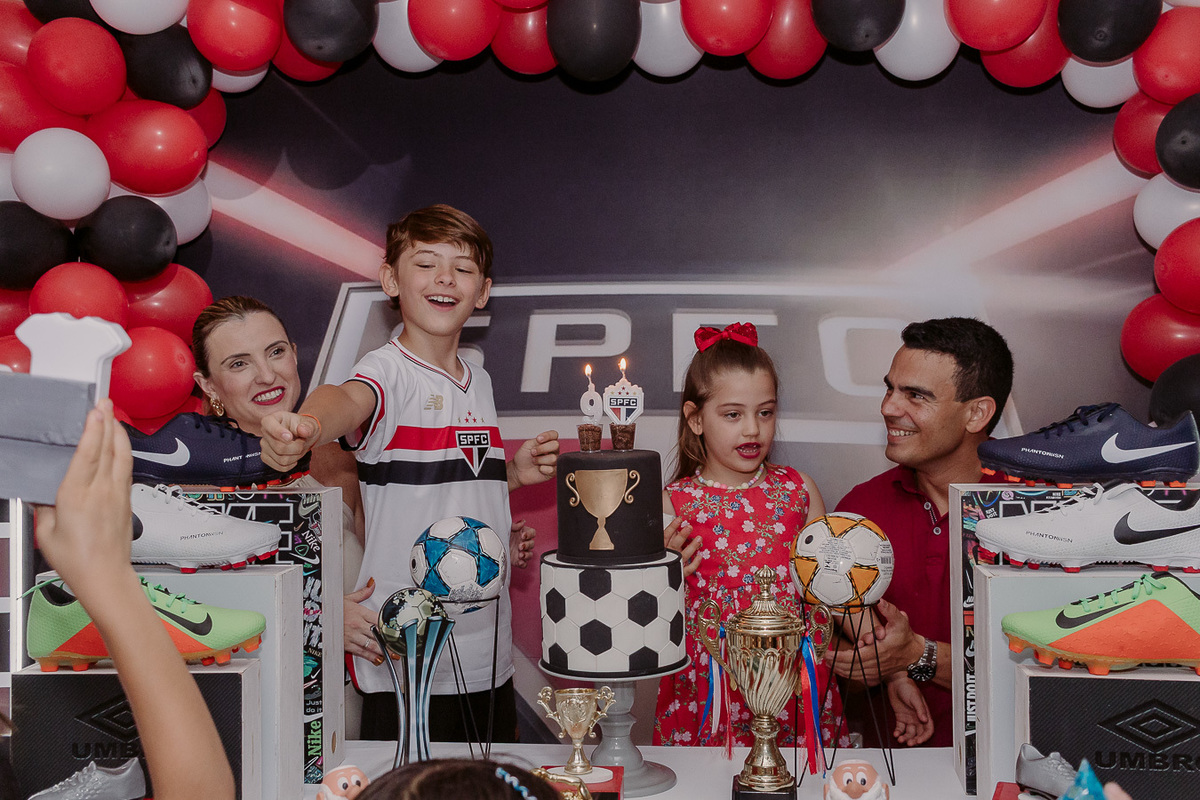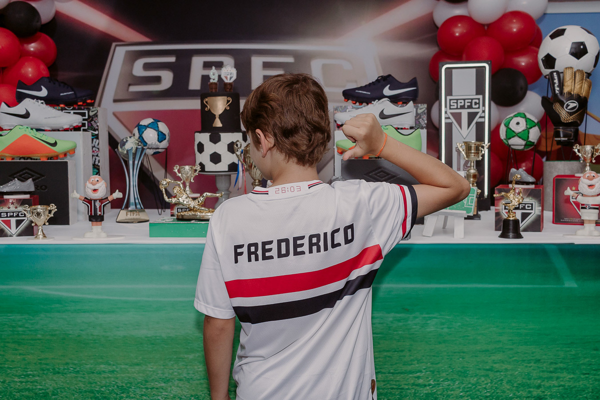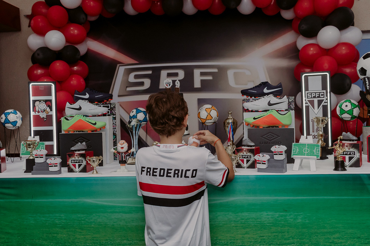 A festa de 9 anos do Frederico teve como tema o amor pelo seu time de coração, o São Paulo Futebol Clube. Com uma decoração inspirada nas cores e no escudo do time, a comemoração foi marcada por momentos descontraídos, muita animação e a energia típica de quem vive intensamente essa fase da infância.